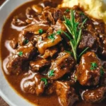 A comforting dish of tender beef simmered in rich gravy, perfect for family dinners or special gatherings.