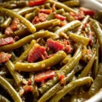 A comforting side dish combining fresh green beans and smoky bacon, perfect for any meal or gathering.
