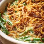 A beloved classic casserole made with green beans, creamy mushroom soup, and a crispy onion topping, perfect for family gatherings and holiday meals.