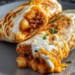 A delightful twist on traditional burritos, combining crispy tater tots, seasoned ground beef, and cheddar cheese wrapped in soft tortillas.