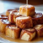 Warm, gooey cinnamon roll bites transformed into a decadent French toast treat, perfect for brunch or breakfast.