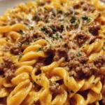This rich and indulgent pasta dish combines ground beef with a creamy garlic butter sauce, creating a comforting meal perfect for weeknight dinners.