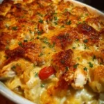 A comforting and easy chicken casserole made with rotisserie chicken, creamy goodness, and a crispy topping, perfect for any gathering.