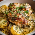 - Pour the cheese and herb mixture over the chicken and potatoes, ensuring they are well-coated.
