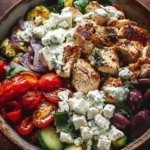 Assemble the Bowls: In serving bowls, layer a generous amount of chopped lettuce, sliced chicken, diced tomatoes, sliced red onion, crumbled feta cheese, and olives.