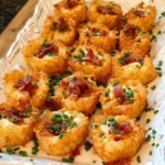 Crispy and cheesy tater tots loaded with bacon and topped with sour cream and green onions, perfect for any gathering.