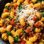 You build flavor in layers. First, the onion and garlic get soft and fragrant. Then the beef browns in the pan and adds a deep, savory taste. Tomatoes and broth bring everything together. The pasta cooks right in the pan, so it absorbs all those good flavors. At the end, you fold in fresh spinach. It wilts down and adds a nice green touch and a mild, fresh taste.