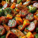 A comforting sheet pan meal featuring savory sausage, sweet potatoes, and broccoli, drizzled with a delicious honey garlic sauce. Perfect for busy weeknights!