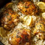 A comforting dish of tender chicken thighs infused with lemon and herbs, paired with fluffy rice for a delightful meal.