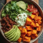 Creating a Sweet Potato Taco Bowl is as simple as it is satisfying. First, you’ll roast the sweet potatoes to bring out their natural sweetness. Meanwhile, you’ll brown some beef (or your choice of protein) and season it with bold taco spices. Finally, everything comes together beautifully in a bowl topped with fresh pico de gallo, creamy guacamole, and a sprinkle of sour cream.